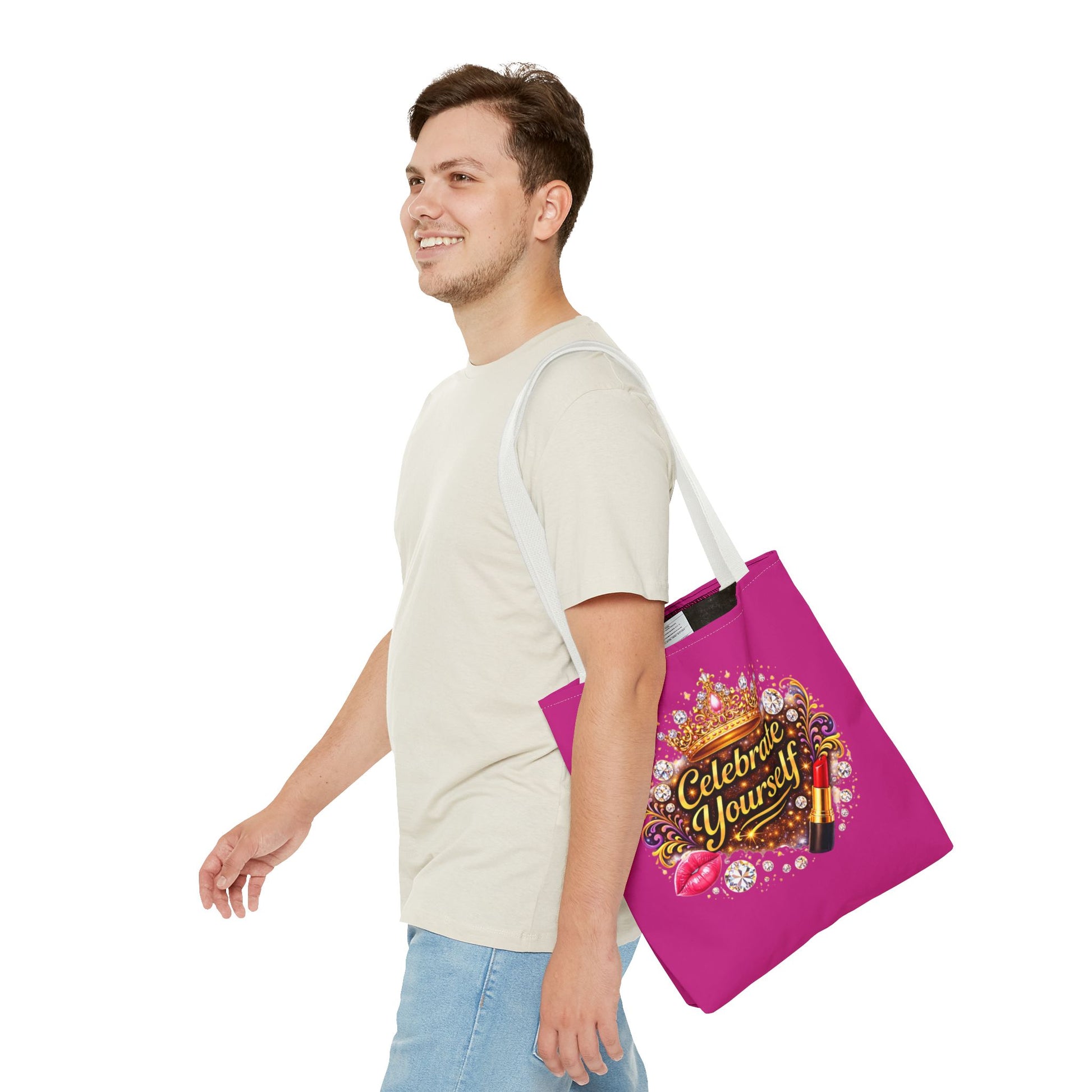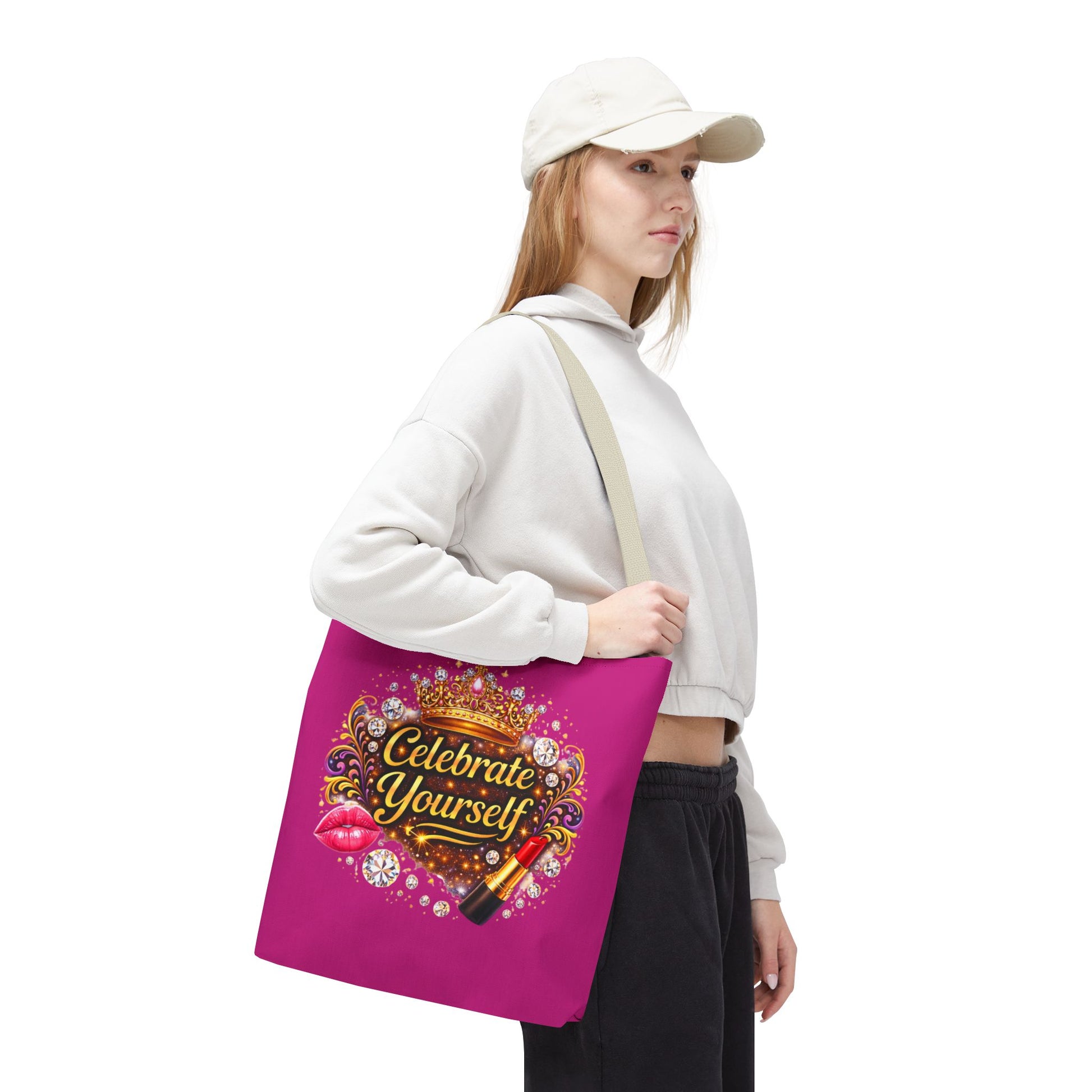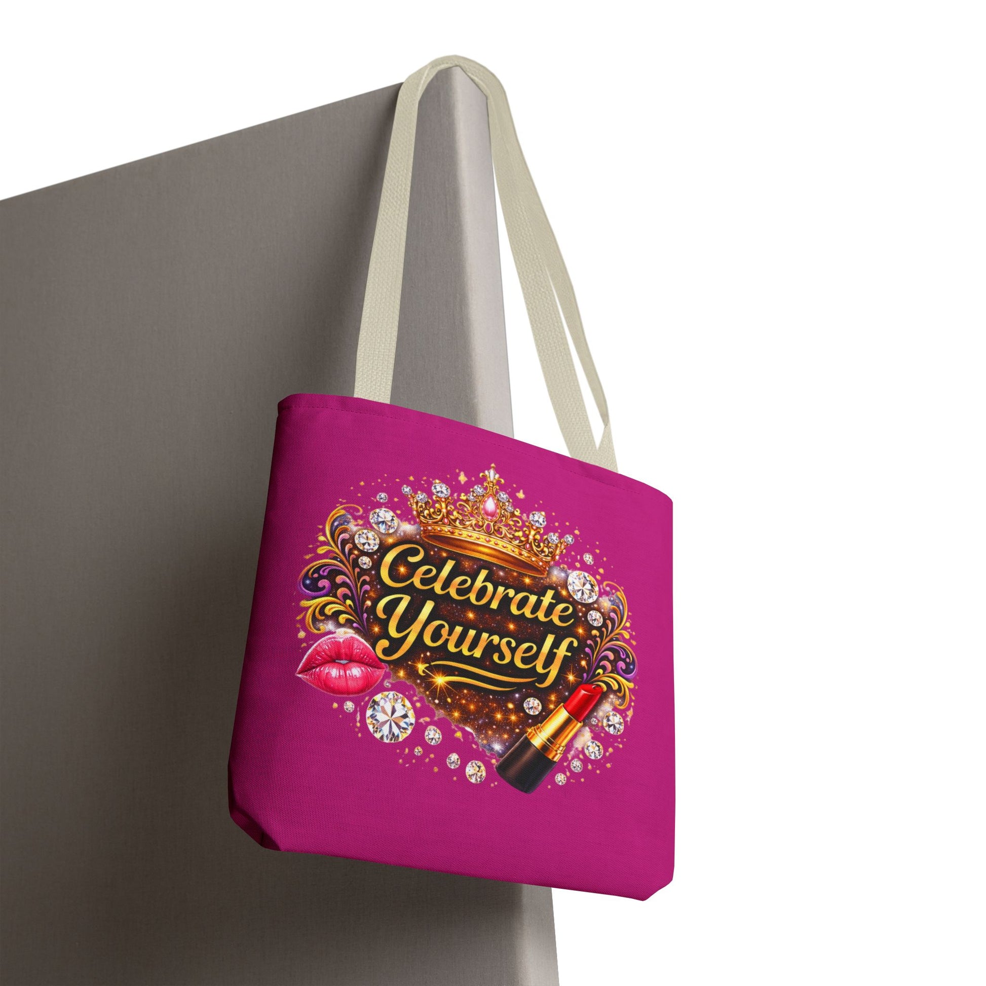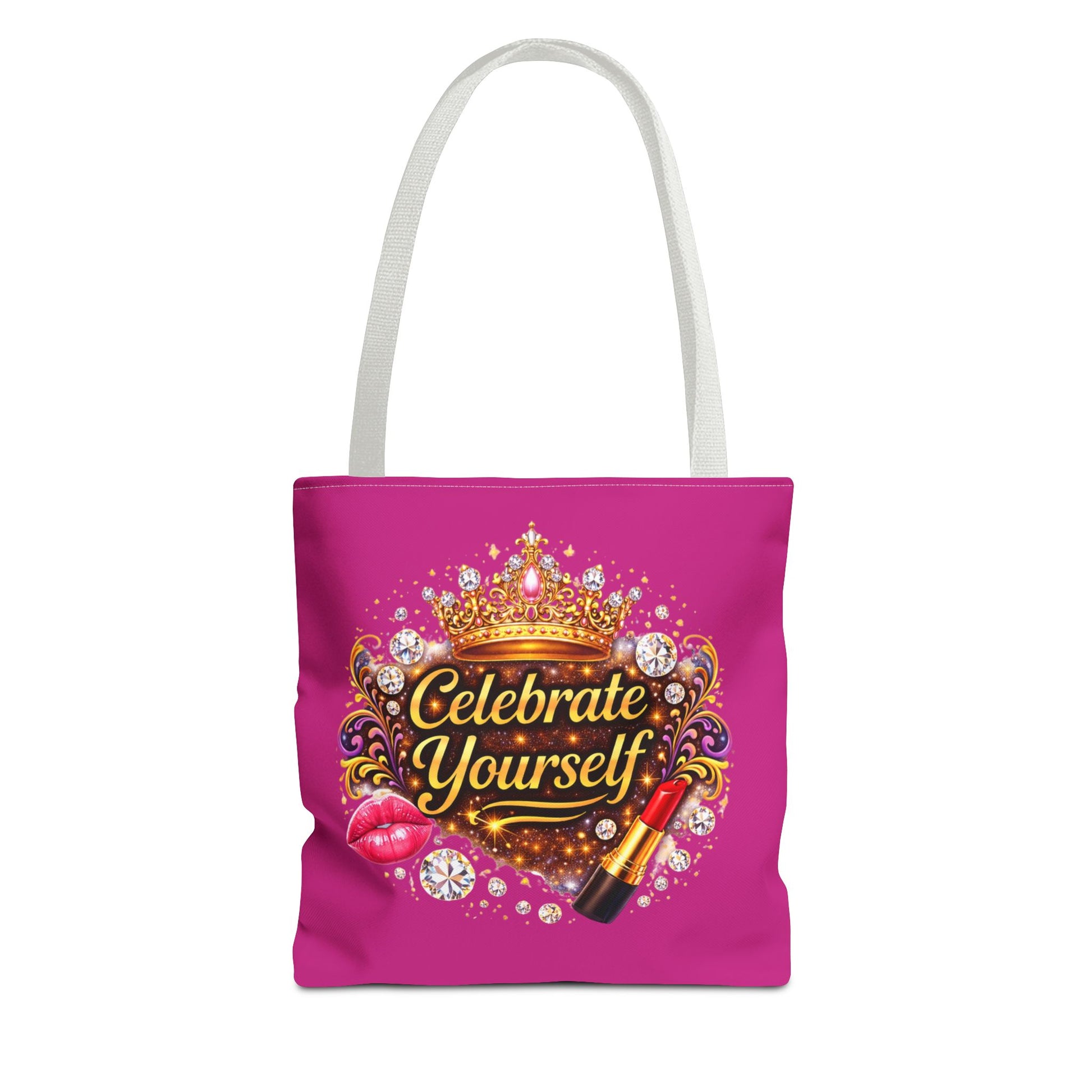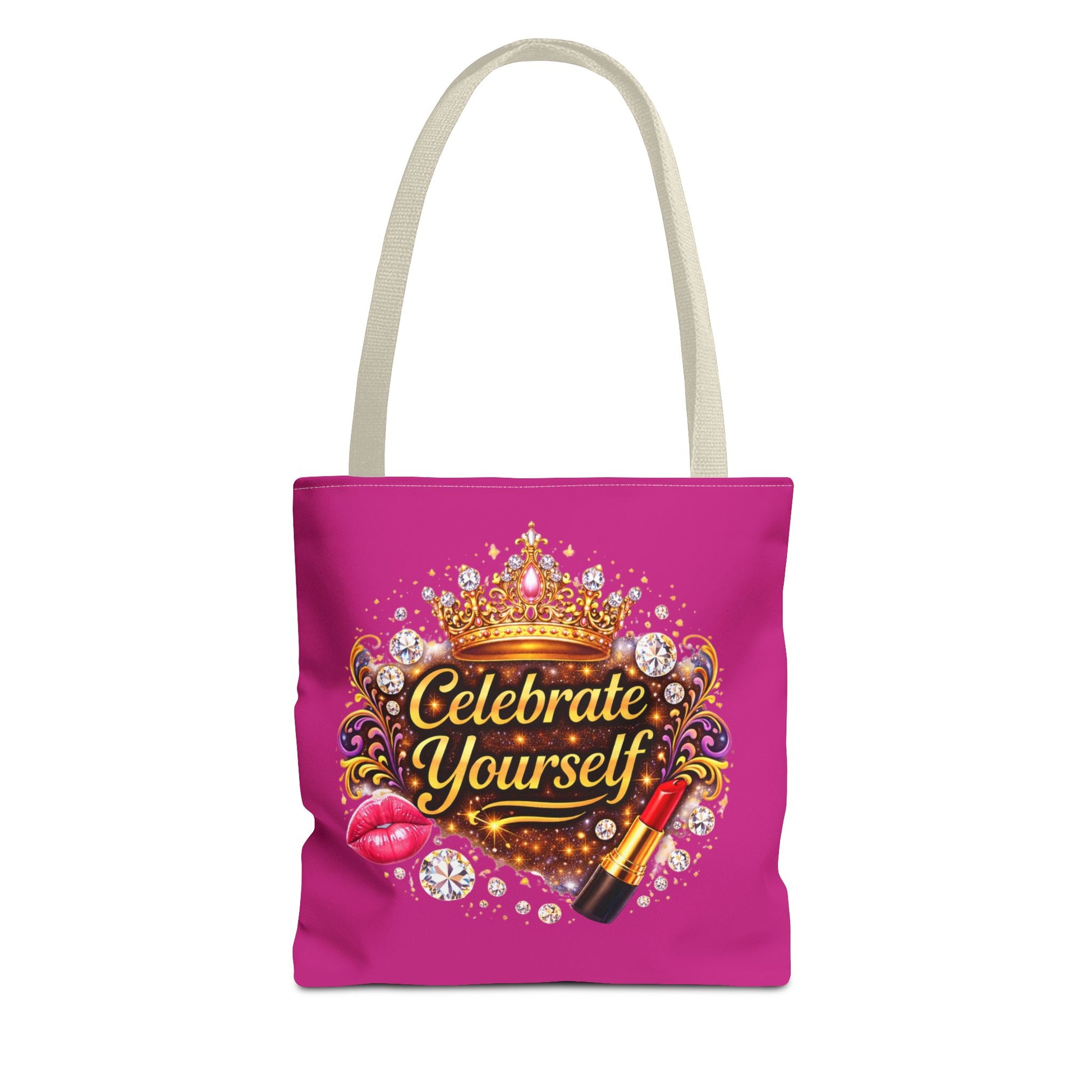 Bright, bold, and unapologetically celebratory — this roomy tote turns everyday errands into a little ritual of self-appreciation. A vibrant magenta background frames a jeweled crown, sparkling gems, lipstick and glossy lips around the uplifting message “Celebrate Yourself.” The design reads like a wink in the mirror: confident, fun, and a reminder to treat yourself well. Sturdy polyester holds its shape while boxed corners add carrying space for groceries, notebooks, or a weekend change of clothes. Black stitching and a choice of handle colors give the bag a finished, polished look that stays practical and playful. Wear it to run errands, pack it for a weekend away, or bring it along to beauty nights and galas — it’s made to carry what matters with a little flair.