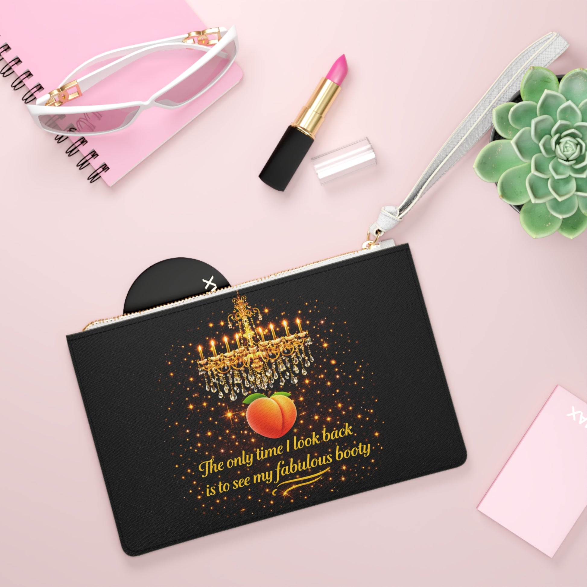Softly glamorous and a little cheeky—this compact clutch brings sparkle to nights out without fuss. The saffiano-textured PU leather holds its shape while the gold zipper and white wrist strap add contrast and polish. Inside, two compartments and a small pocket keep cards, lipstick, and keys organized. On the front, a playful peach motif beneath a glittering chandelier and a humorous line give the bag personality and attitude. Slim enough to tuck into a tote or carry solo, it’s the kind of accessory that lights up a get-together and keeps essentials close when you want to move freely.