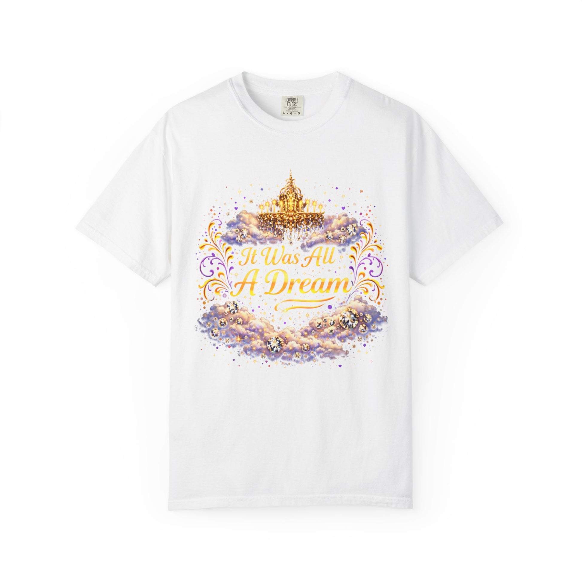 This soft, garment-dyed tee feels like a worn-in keepsake you reach for when you want comfort with a little story. The front illustration — a dreamy golden castle nestled in clouds with ornate filigree and the script, “It Was All A Dream” — reads like a quiet promise of wonder. Wear it on slow mornings with tea, at bookshop afternoons, or layered under a cardigan for twilight walks. The relaxed cut and heavyweight cotton give it substance without stiffness; the muted, lived-in color from post-construction dyeing makes the graphics sit like part of the fabric rather than pasted on. This shirt suits someone who collects small, poetic moments and likes clothing that whispers a mood instead of shouting style trends.
