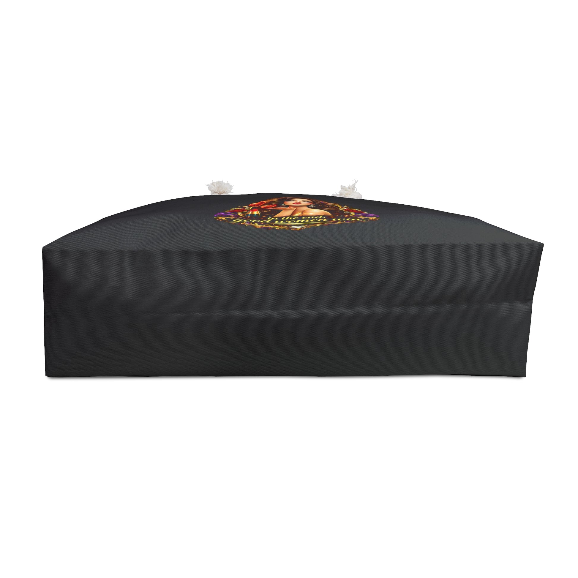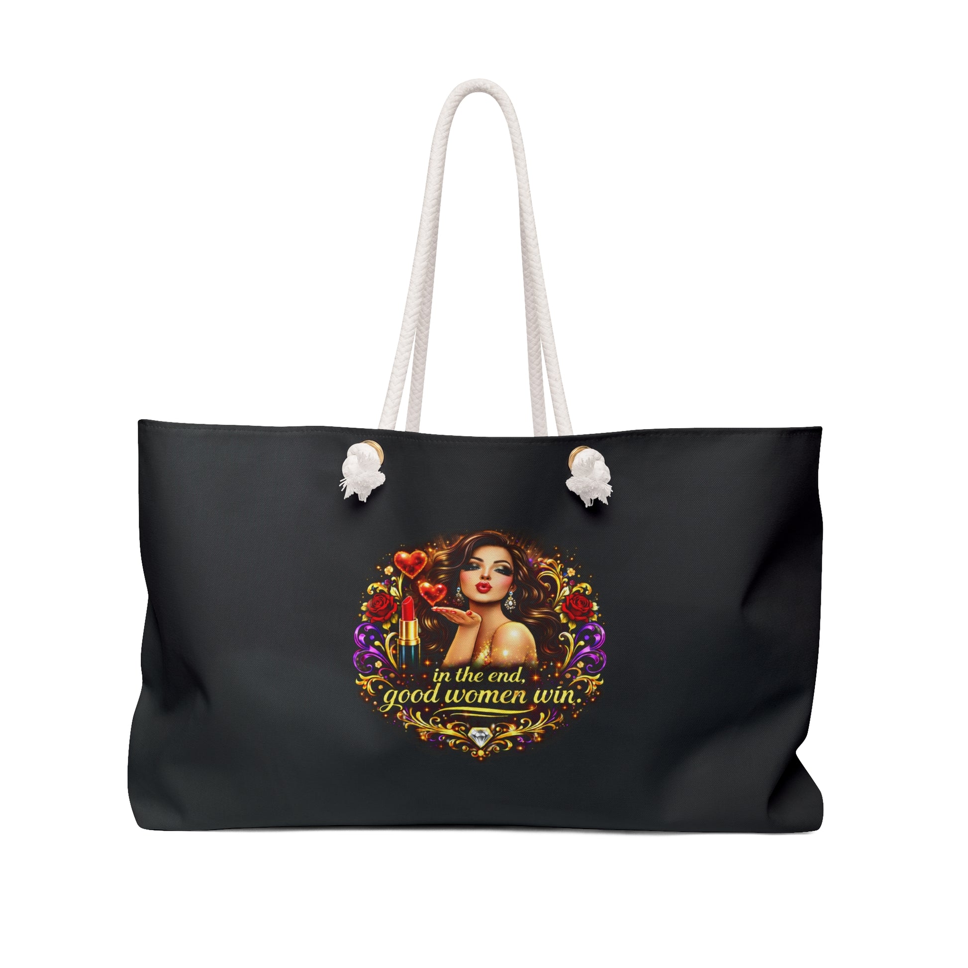 A roomy, stylish weekender built for effortless travel and laid-back weekends. The smooth spun polyester exterior resists wrinkles so the bag keeps a polished look straight from the car to the hotel lobby. Soft cream rope handles loop through gold-tone grommets for a nautical, tactile contrast that feels comfortable on the shoulder. Inside, a cream cotton-blend lining and a sturdy T-bottom keep contents organized and upright. At roughly 24" x 13", it holds an overnight wardrobe, a few toiletries, and extras without feeling bulky. Thoughtfully assembled in the USA from globally sourced parts, this bag blends practical durability with a touch of feminine artwork at the center — a quiet statement piece for those who travel with style and confidence.