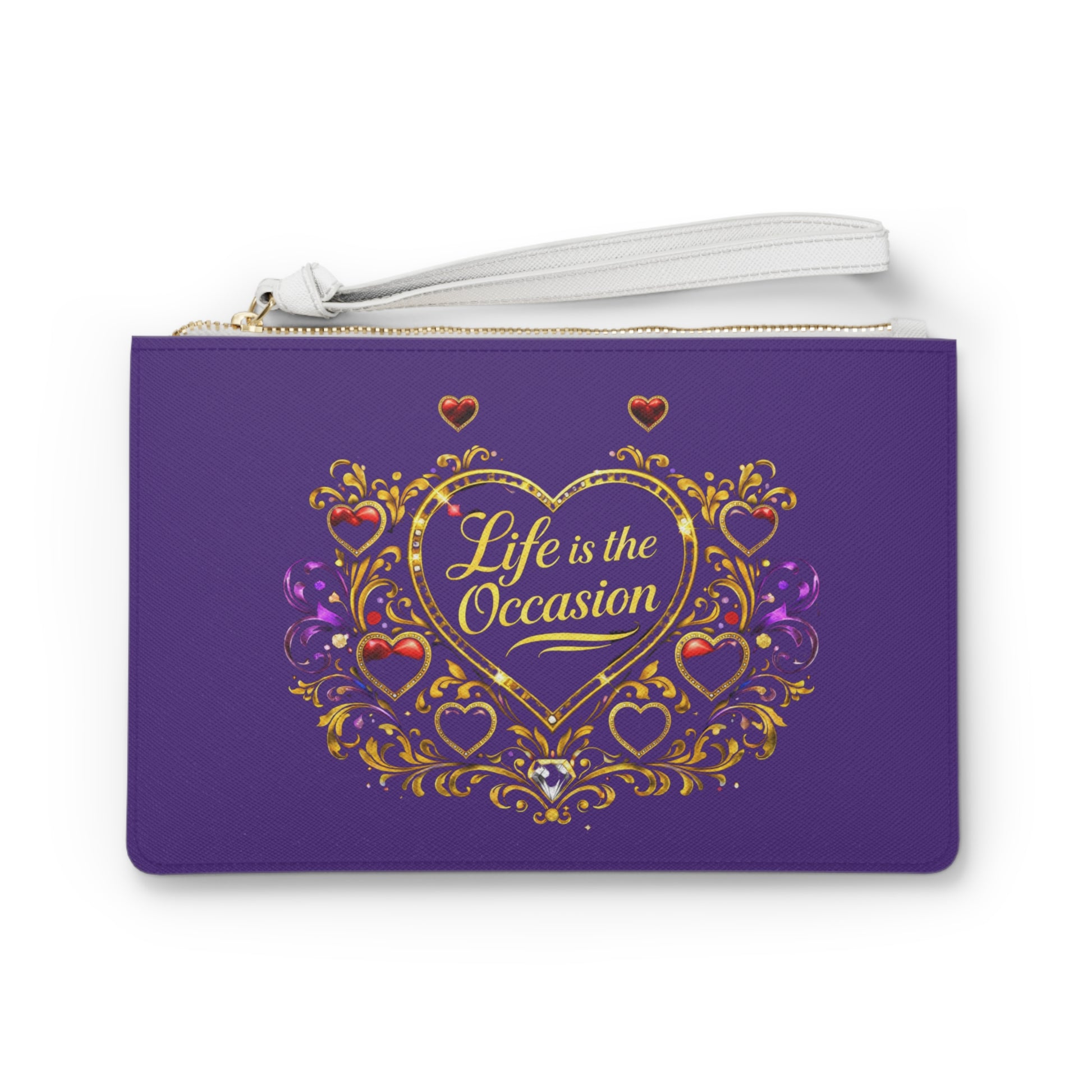 This clutch bag carries a bold, celebratory spirit — a jewel-toned companion for someone who treats everyday moments like a small ceremony. The purple saffiano-textured faux leather gives structure and a subtle crosshatch sheen, while the ornate gold-and-red heart motif declares “Life is the Occasion” in elegant script. It slips easily onto the wrist with a white strap, keeps essentials organized with two compartments plus a small inner pocket, and closes with a sturdy gold-colored metal zipper. Wear it to evenings out, brunches, or when you want to carry a bright, confident reminder to celebrate now.