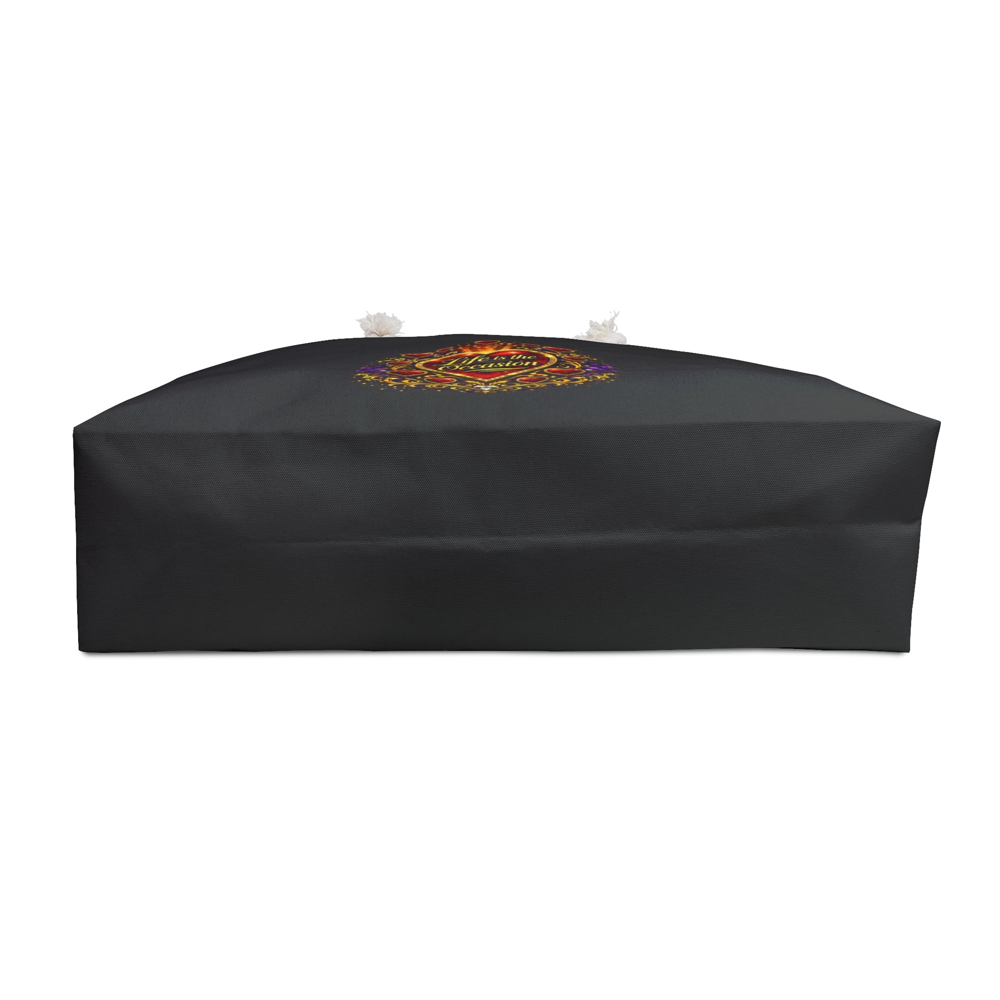This roomy weekender carries more than clothes — it carries intention. Soft cream rope handles and a generous T-bottom give it that easy, unpack-and-stay-a-while energy. The matte black spun polyester exterior resists wrinkles and keeps the bag looking pulled-together, while the cream sheeting lining adds a warm, familiar contrast inside. A small, ornate emblem on the front — carved in warm reds, golds and jewel tones — reads like a keepsake: a reminder to celebrate the journey, not just the destination. It’s the kind of bag you grab for a weekend away, a short road trip, or an overnight visit with friends, and it settles into the rhythm of your plans without fuss.