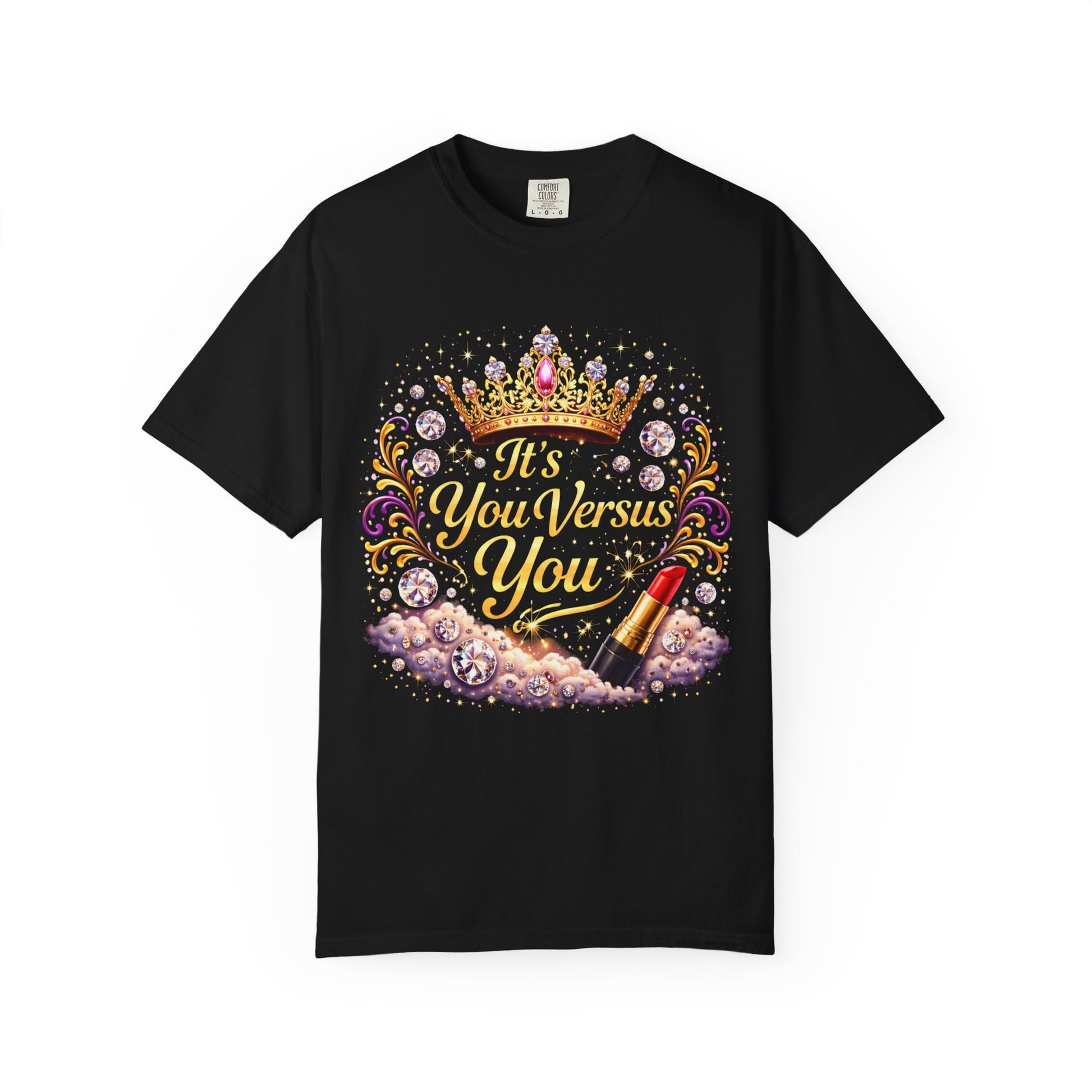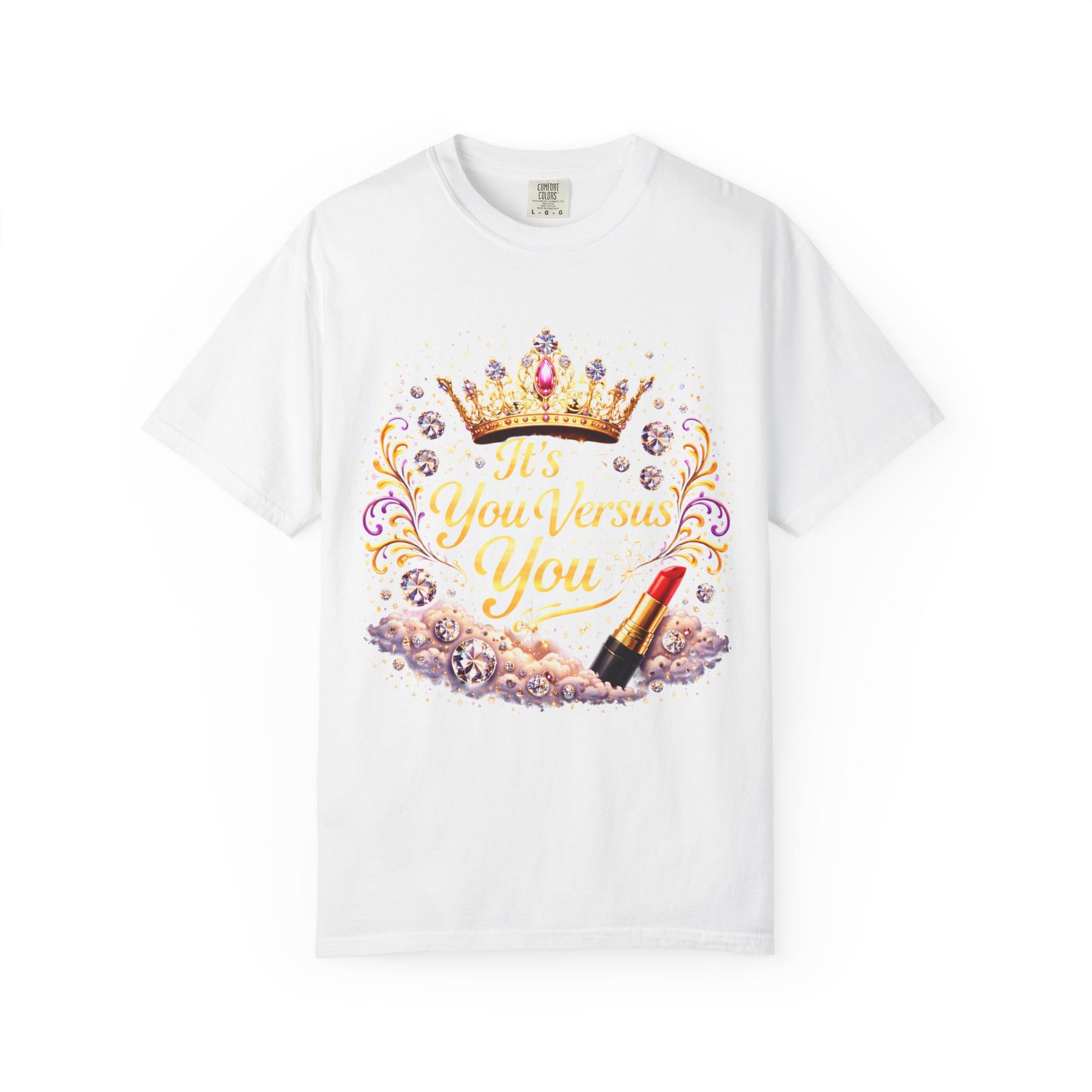 A soft, garment-dyed tee that reads like a little celebration you can wear. The front artwork mixes a jeweled crown, shimmering flourishes and a luxe lipstick motif around the phrase “It’s Your Business You,” giving the shirt a playful, confident voice. The heavyweight cotton and relaxed cut feel substantial yet worn-in, the kind of shirt you reach for when you want to show a bit of sparkle without trying too hard. Worn with jeans for coffee runs or layered under a blazer for casual nights out, it’s for people who like style with attitude and a wink of glamour.